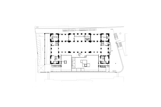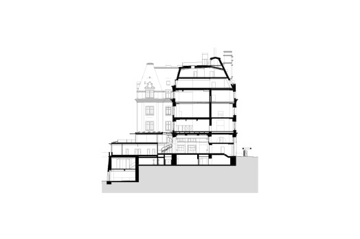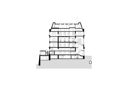 Die Planung sieht vor, die Erschliessung und Versorgung in zwei grossen, symmetrisch angeordneten Kernen zusammenzufassen. Angrenzend an die historischen Treppenhäuser ersetzen diese Volumen Treppen, die in den 1970er-Jahren angelegt wurden und nur einen geringen historischen Wert haben. Die Intervention löst die Probleme der vertikalen und horizontalen Erschliessung und erfüllt zugleich alle geltenden Vorschriften.