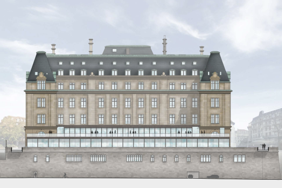 Da die Fassade geschützt ist, dürfen keine Veränderungen an ihr vorgenommen werden. Eine Reinigung mit einem Nasssandstrahler sowie der Austausch von stark beschädigten Elementen werden ihr jedoch neues Leben einhauchen. Das Dach soll komplett saniert werden. Geplant ist, dass die Spenglerarbeiten im historischen Stil ausgeführt werden. Auch die alten Schieferziegel sollen wiederverwendet werden, sofern diese in gutem Zustand sind. Über dem zentralen Teil des Gebäudes wird ein Rooftop- Bereich entstehen, in dem wahrscheinlich ein Restaurant mit Bar untergebracht ist. Mit diesen Eingriffen beabsichtigen die Architekten von CCHE, das gesamte Bauwerk neu zu organisieren und es von seiner ursprünglichen Form in eine zeitgemässe Erscheinung mit einer eigenen Logik weiterzuentwickeln. Es geht folglich darum, den lange nötigen Umbau zu orchestrieren und den historischen Bestand aufzuwerten.