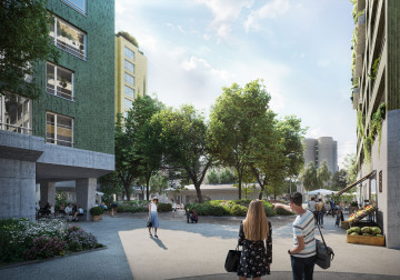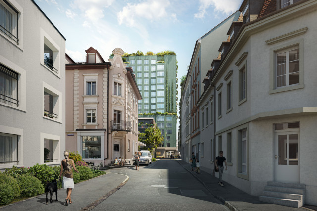 Genau wie jessenvollenweider spannten auch die beiden anderen Architekturbüros mit Landschaftsarchitekten zusammen – GWJ mit David Bossard aus Bern, HHF mit Bryum aus Basel –, und die Überlegungen beschränken sich nicht nur auf die differenziert gestalteten Aussenräume, die als Piazza, Square, Wohnhof, Walzwerkgasse, Gewerbehof und Garten unterschiedliche Aufenthaltsqualitäten haben sollen. Wichtige Bausteine sind überdies Biodiversität hinsichtlich der Pflanzenauswahl sowie Dachbegrünung und Urban Gardening. Wie die Visualisierungen der Punktbauten von jessenvollenweider zeigen, soll gerade bei den Hochhäusern auf Fassadenbegrünung gesetzt werden. Allerdings ohne kostenintensive und fragwürdige Bepflanzungs- und Bewässerungssysteme, wie sie etwa für die viel publizierten Hochhäuser Bosco Verticale von Stefano Boeri in Mailand charakteristisch sind und inzwischen vielfach Nachahmung gefunden haben – auch in der Schweiz. Für die Bepflanzung auf dem vanBaerle-Areal werden in den meisten Bereichen die Bewohnerinnen und Bewohner selbst sorgen, ohne die Hilfe von automatisierten Systemen, die sich zwischen Mensch und Natur stellen.
