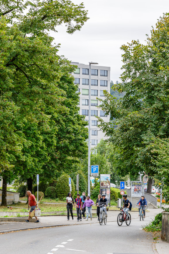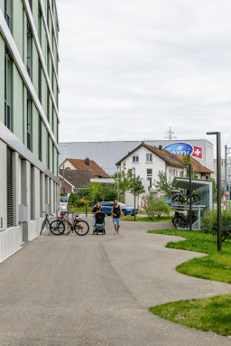 Rosa Ineichen lebt fast ganz oben im Hochhaus. Sie schätzt die Ruhe in der Höhe. Ihre Arbeit als Pflegeleiterin im Altersheim ist fordernd, nicht zuletzt, weil immer zu wenig Personal zur Verfügung steht. Doch der Umgang mit den älteren Menschen erfüllt sie. Nun hatte sie Glück und konnte sich eine Eigentumswohnung leisten. Sie lebt gern im Quartier und lobt die bauliche Qualität. Etwas Zweifel hat sie an den biodivers gestalteten Aussenräumen: «Sie wirken unordentlich, und irgendwo braucht es doch auch ein Stück Rasen.» Trotzdem sieht sie immer wieder Kinder, die fröhlich um die Häuser rennen.