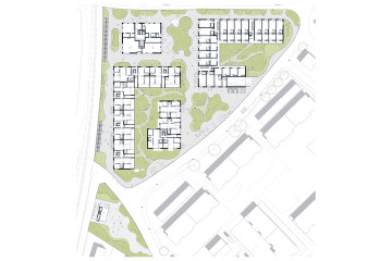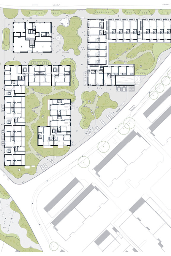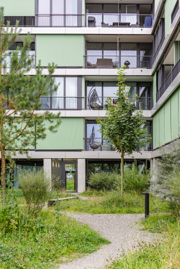 Entstanden sind 202 Wohnungen nach den Standards der 2000-Watt-Gesellschaft. Die Dichte von 1,9 wurde mittels eines kleinen Hochhauses und drei vier- bis sechsgeschossigen Zeilenbauten erreicht. Gassen, grüne, halb offene Höfe und ein zentraler Platz bieten unterschiedliche Aufenthaltsmöglichkeiten. Das Gewerbe wurde an dieser Lage auf ein Minimum reduziert: Im Hochhaus befinden sich vier Flächen, die im Stockwerkeigentum veräussert wurden. Nur im Fall der Pizzeria ist der Käufer auch der Nutzer, die anderen dienen als Investment. Ein Coiffeur und ein Fitnessstudio sind bereits eingezogen. Das Wohnungsangebot ist mit einer Mischung aus Eigentum und Miete, durchgesteckten Atelierwohnungen in Überhöhe, Kleinwohnungen mit verschiebbaren MOVEment-Möbelmodulen, Familienwohnungen sowie 3- und 4-Zimmer-Wohnungen sehr breit und preislich im Mittelfeld angesiedelt. Die Aussenräume wurden sorgfältig gestaltet. Es gibt einen zentralen Platz mit Wasserspiel, Erschliessungsgassen mit hohem Öffentlichkeitsgrad und Höfe, die Rückzug ermöglichen und Geborgenheit vermitteln. Da die Tiefgarage fast unter dem gesamten Areal liegt, wurden für einzelne Bäume Gruben ausgespart, damit sie richtig wachsen können. Die Böden sind zu weiten Teilen entsiegelt und biodivers gestaltet.