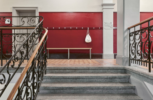 Der Aufenthaltsraum samt Küche zur Hofseite hin wurde schnell zu einem weiteren Favoriten. Auf dem Terrazzofliesenboden steht eine breite Bar, die von Glaskugellampen beleuchtet wird. Dieselben mundgeblasenen Leuchten von Bocci kommen auch über der Treppe, welche die Stockwerke intern verbindet, zum Einsatz und sind wie im Wasser aufsteigende Luftblasen montiert. «Die gesamte Beleuchtung basiert auf diesem Konzept. Die Decken über den langen geraden Gängen etwa werden durch das warme, in Wellenlinien geführte LED-Licht aufgewertet», sagt Kerstin Schuller. Die eindrucksvolle Treppenkonstruktion besteht aus reinweiss pulverbeschichtetem Stahl mit Füllelementen aus Glas. Die Tritte sind rundum mit Eichenparkett verkleidet. Über sie gelangen Sportliche vom dritten bis ins fünfte Obergeschoss oder umgekehrt.