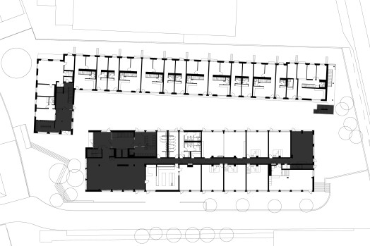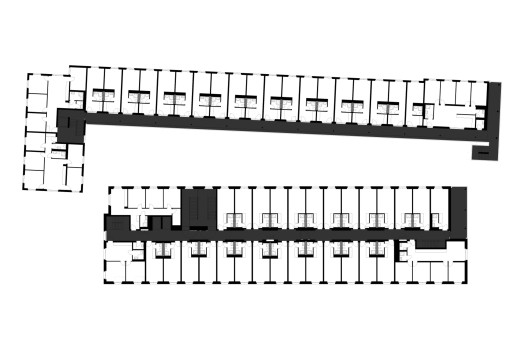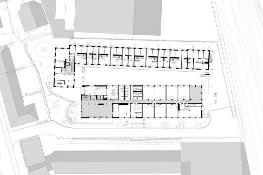 Möglichst viele gleiche Elemente zu schaffen, sei eine weitere Strategie gewesen, um Kosten zu sparen, sagen die Architekten. Die Zimmer der Häuser sind gleich geschnitten und gleich ausgestattet, nur an den jeweiligen Gebäudestirnen und im Kopfbau befinden sich grössere, zumeist als Wohngemeinschaften gedachte Wohnungen mit bis zu neun Zimmern. Die Nasszellen kamen komplett vorinstalliert auf die Baustelle. Und noch eine Strategie nennen Gmür & Geschwentner: die Minimierung der beteiligten Gewerke zugunsten eines für die Realisierung verantwortlichen Baumeisters. Diese Entscheidung führte zur einfach zu erstellenden konstruktiven Lösung mit einem Sockel aus Betonfertigteilen und darüber Fassaden aus Einsteinmauerwerk. Dessen maximale konstruktive Höhe führte zu dem viergeschossigen Betonsockel am Haupthaus.