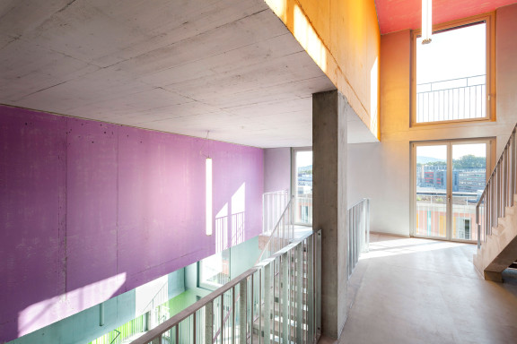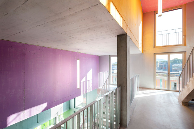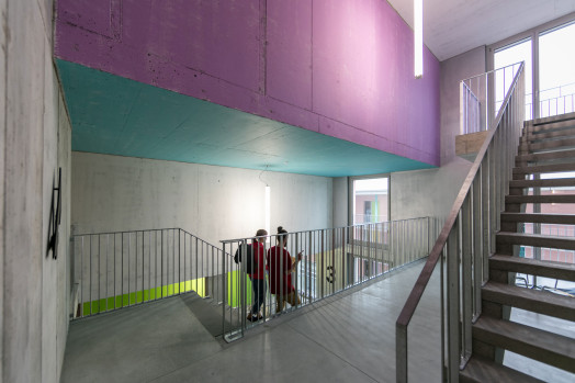 Der dunkelviolette Farbton, der auch Caput mortuum heisst, bildet den Grundton des Gebäudes. Bei einer Aussendämmung liesse er sich nicht verwenden, da sich die Fassadenhaut aufgrund der geringen Reflektion zu stark erwärmen würde. Doch bei einer klassischen Putzfassade stellt das kein Problem dar. Farbiger zeigt sich die als Laubengang ausgebildete Hoffassade des viergeschossigen Winkelbaus: Hinter den hellblauen Stützen sind die Fassaden pink gestrichen und die Wohnungstüren in wechselnden Farben. Diese Buntfarbigkeit bestimmt auch die farblich schier explodierende Kaskadentreppe und die Korridore im Haupthaus.