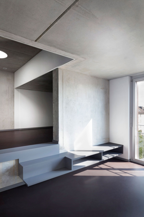 So zum Beispiel mit dem räumlich opulenten Saal des Restaurants, das an der Stirn des Langhauses einen öffentlichen Akzent setzt. Oder, worauf sie besonders stolz sind, mit der quer gelagerten Kaskadentreppe, die, von Geschoss zu Geschoss die Richtung wechselnd und um eine Achse verspringend, eine atemberaubende Diagonale im Langhaus bildet. Diese «Goethe-Treppe», wie sie sie gerne nennen, bildet den Erschliessungskern, weil man von ihr aus die Korridore des zweibündig organisierten Hauses erreicht, sie fungiert aber zugleich als ein kommunikatives Zentrum. Die Treppe gab es schon im ersten Projektentwurf, und den Architekten ist es gelungen, sie über alle Sparrunden zu retten. Zur Wohnqualität tragen überdies die gemeinschaftlichen Balkonterrassen an den östlichen Gebäudestirnen bei, von denen man einen grossartigen Blick über Zürich geniesst.