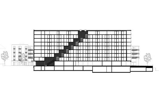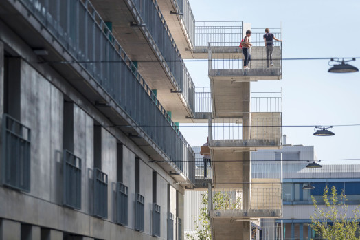 Die Fluchttreppen des Laubenganghauses auf der Ostseite dienen auch als kommunikativer Treffpunkt. An den Gebäudestirnen befinden sich überdies Gemeinschaftsbalkone.