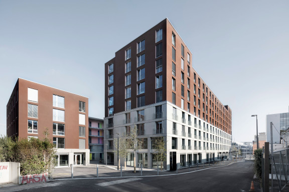 Das von der Stiftung vorgelegte Konzept umfasste nicht nur die Anzahl der Wohnungen, sondern auch garantierte Mietpreise. Nächster Schritt war ein Wettbewerb auf Basis dieser Parameter, und zwar in Form eines nicht anonymen Studienauftrags unter sechs eingeladenen Architekturbüros. Durchsetzen konnte sich das Projekt Binz 111 des Zürcher Büros Gmür & Geschwentner: ein robustes, sich in die industriell geprägte Umgebung einfügendes Ensemble aus einem lang gestreckten, achtgeschossigen Block und einem winkelförmigen, dreigeschossigen Volumen mit viergeschossigem Kopfbau.