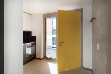 Im Laubenganghaus gelangt man zunächst in die Küchenzone, während sich die Wohnbereiche zur anderen Seite hin orientieren. Die Standardapartments messen 25 Quadratmeter.