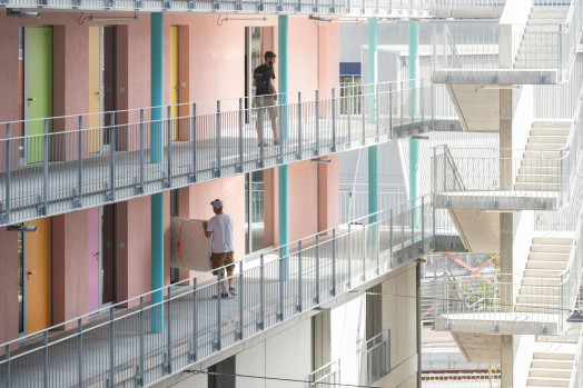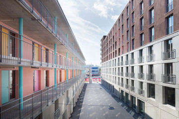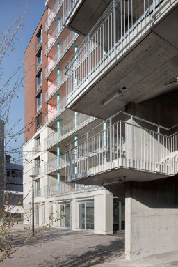 Ein Hofraum, der sich Richtung Osten zum Gleisfeld öffnet, liegt zwischen dem neungeschossigen Haupthaus und dem fünfgeschossigen Laubenganghaus. Hellblaue Stützen, pink gestrichene Fassaden und Türen in wechselnden Farben setzen beim Laubenganghaus Akzente.