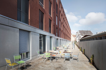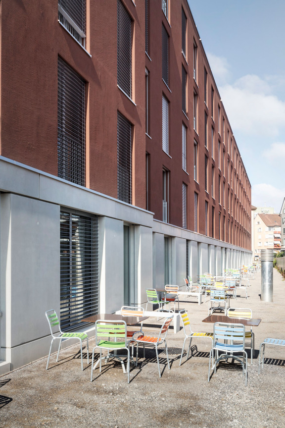 Eine Betonwand grenzt das Laubenganghaus von dem benachbarten Materiallager ab. Eine grosse, hofartige Freifläche kann informell von den Bewohnerinnen und Bewohnern als Aussenraum genutzt werden und ist mit Gartenmöbeln ausgestattet.