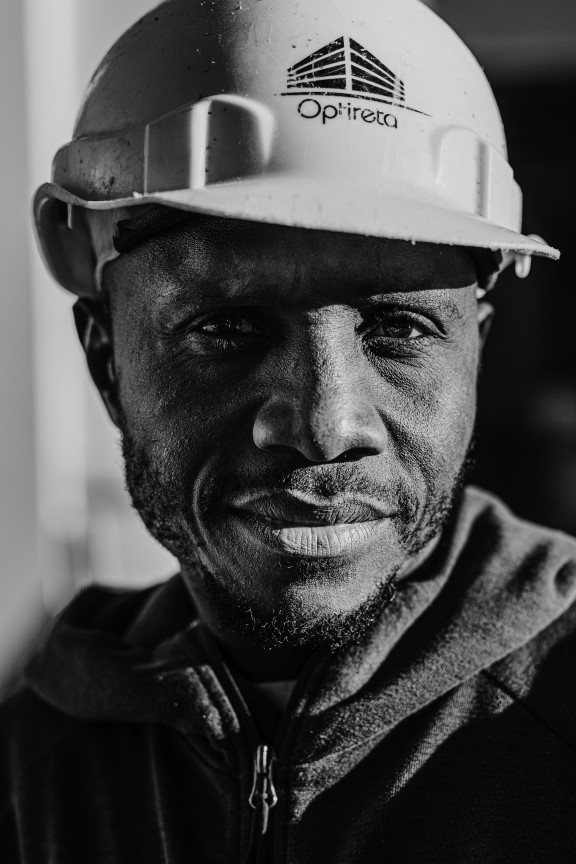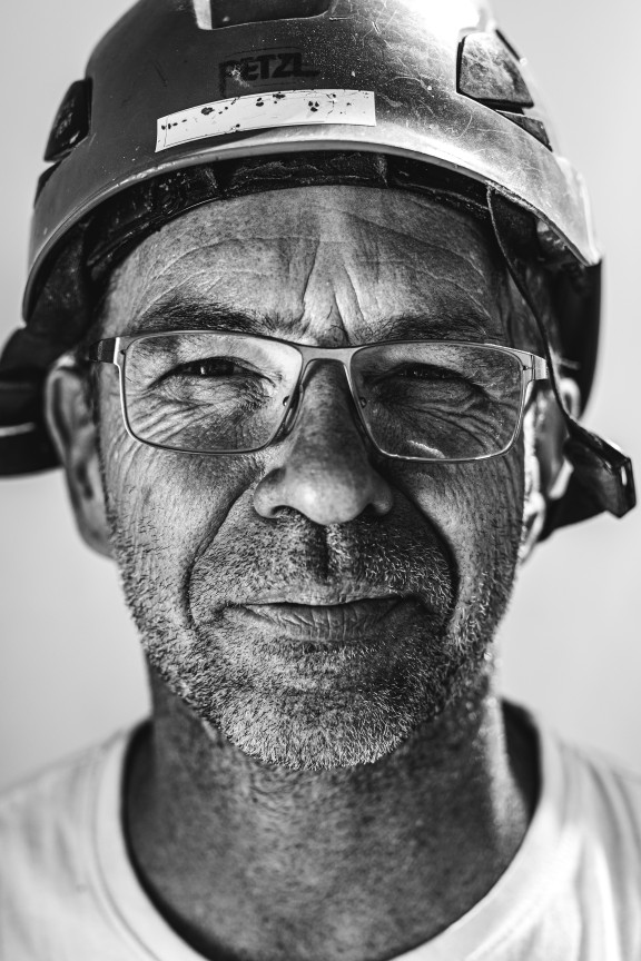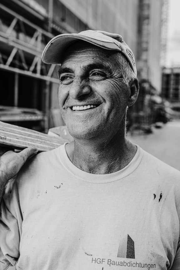 Über vier Jahre hinweg, zwischen 2021 und 2025, besuchte der Fotograf Philip Böni die Baustelle auf dem ehemaligen Alusuisse-Areal in Neuhausen alle zwei Monate. Im Auftrag der Halter AG dokumentierte er den Baufortschritt des Entwicklungsprojekts Rhyfall Village. Mit der Zeit fand er sich nicht nur auf dem Gelände immer besser zurecht, auch die Handwerker waren keine Fremden mehr. Viele Gesichter kannte er vom Sehen, mit einigen der Männer hatte er schon ein paar Worte gewechselt. Mit dem Kontakt erwachte ein neues Interesse. Das an den Menschen, die mit ihrer körperlichen Arbeit die Gebäude entstehen liessen: Maurer, Gerüstbauer, Eisenleger, Gipser, Abdichter, Maler, Schreiner, Lüftungsmonteure. Viele von ihnen mit Migrationshintergrund, viele der deutschen Sprache nur bruchstückhaft mächtig, viele scheu – und doch immer stolz. Im Sommer 2023 richtete Philip Böni vor einem Betonschalungselement als Hintergrund ein Open-Air-Studio ein. Er fotografierte immer zur Mittagszeit, wenn das harte natürliche Sonnenlicht die schweissnasse Haut glänzen liess. «Ich hatte nur ein paar Sekunden, um das Porträt zu schiessen. Sobald die Männer ins Überlegen kamen, war es schon zu spät», erklärt Philip Böni. Andere Aufnahmen entstanden als Schnappschüsse auf der Baustelle im Rahmen der Reportagefotografie. «Das Wichtigste ist mir, dass die Menschen, die ich ablichte, sie selbst sein können. Nur dann ist auch meine Arbeit gelungen», fügt der Fotograf an.