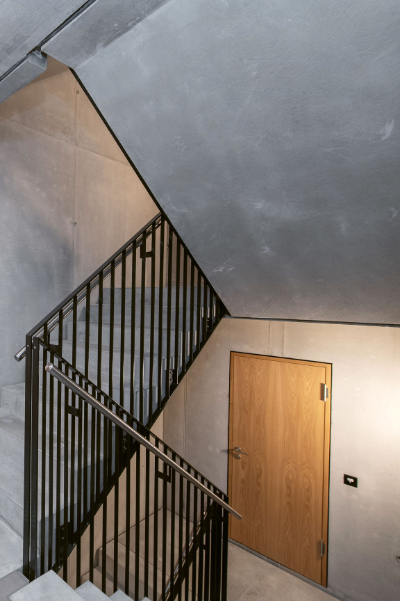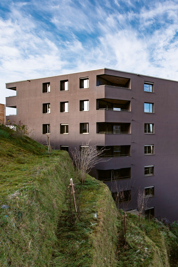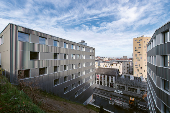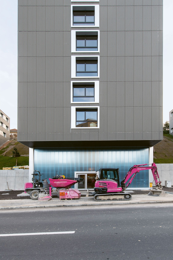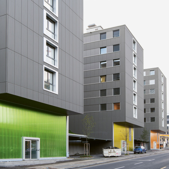 Als hätte ein Riese sechs Bausteine mit einem Fingerstubs in den Hang hineingeschoben, so erscheinen die neuen Gebäude für studentisches Wohnen an der Route de la Fonderie in Fribourg. Ihre Entstehung hat jedoch nichts mit einer märchenhaften Begebenheit zu tun, sondern eher mit einer intelligenten Planung. Das Büro KPA Architekten realisierte für die Anlagestiftung Apartis anstatt zweier ursprünglich angedachter Riegel entlang der Hangkante des Butte de Pérolles einzelne quer stehende Volumina. Durch diesen Schachzug konnte die bestehende Topografie erhalten bleiben, noch dazu bietet das abschüssige Gelände für fünf achtstöckige Häuser mit insgesamt 413 Zimmern die Vorlage für eine Erschliessung von zwei Seiten: auf Strassenniveau an der Route de la Fonderie über einen zweistöckigen Sockel mit blauer, grüner, gelber, orange- oder pinkfarbener Polycarbonatfront; vom Hang her auf der Rückseite der mit gewellten Faserzementplatten verkleideten Gebäude durch einen Kiesweg, der auf dem grünen Grat verläuft. Das sechste Haus hebt sich mit seinem polygonalen Grundriss und der dunkleren, verputzten Fassade deutlich von den anderen ab. Hier befinden sich denn auch 28 Wohnungen unterschiedlicher Grösse, die für junge Erwachsene gedacht sind. Mit der Übergabe durch Halter Entwicklungen im Frühjahr 2021 wurde dem sich seit einigen Jahren in Transformation begriffenen, ehemaligen Industriequartier in nächster Nähe zu Fachhochschulen und Universität ein lebendiges Gebäude-Ensemble hinzugefügt. Angelehnt an den Wissenschaftsstandort ist La Fonderie im Minergie-Standard errichtet und wurde mit dem Label Site 2000 watts ausgezeichnet.
