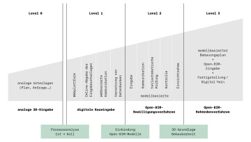 In Wien entwickelte ein Forschungsteam gemeinsam mit den Abteilungen der Stadt Wien einen Open-BIM-Bewilligungsprozess im EU-geförderten Forschungsprojekt Brise-Vienna. Dieses fokussierte sich ganz auf Level 2. Dazu bildete das Team zuerst den gesamten analogen Bewilligungsprozess in einer Prozesslandkarte ab und optimierte sodann den Prozess sowie die Prozessschritte für den digitalen Open-BIM-Bewilligungsprozess.