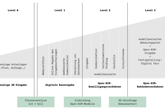 Das Reifegradmodell zeigt die verschiedenen Digitalisierungsstufen im Bewilligungsprozess. Level 0 steht für die analoge 2D-Eingabe: In der Vergangenheit prägten analoge Unterlagen den Bewilligungsprozess. Die Planungsteams zeichneten alle einzureichenden Pläne. Seit der Einführung von CAD wurden die Pläne ausgeplottet und als Papierpläne mit zahlreichen anderen Unterlagen zur Behörde gebracht. Diese teilte die Pläne und die Unterlagen auf die zuständigen Abteilungen auf.