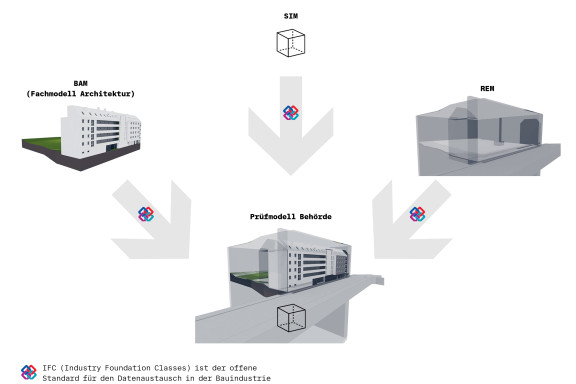Das Fachmodell der Architektur bildet das eingereichte BAM. Für dieses Modell gibt es genaue Anforderungen (Level of Geometry, Level of Information), denn das BAM muss alle Informationen enthalten, die auch bei einer bisher üblichen Einreichung erforderlich waren. So muss beispielsweise klar aufgeführt sein, welche Räume Aufenthaltsräume sind, da für diese spezielle Bestimmungen gelten. Das REM bildet die Einschränkungen des Baugrunds beziehungsweise des Bebauungsplans ab. Es stellt somit gewissermassen eine Umhüllung für die mögliche Bebauung auf dem entsprechenden Grundstück dar. Das SIM entspricht im Open-BIM-Modell einem Würfel, der für jene Bestimmungen steht, die nicht geometrisch dargestellt werden, aber für die baurechtliche und bautechnische Prüfung erforderlich sind.