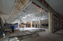 Noch bevor der Mietvertrag mit Zühlke abgeschlossen worden war, erhielt Halter den Auftrag, als Totalunternehmen die JED-Gebäude umzubauen. Ursprünglich umfassten die Arbeiten die Auffrischung der Gebäudehülle, die Aufstockung des Verbindungstrakts, die Anpassung der bestehenden Tiefgarage, den Bau der neuen Zugänge zu den Mietflachen sowie Teile der Haustechnik. Mit der Zusage von Zühlke wuchs das Auftragsvolumen rasch an, und gleichzeitig verkürzte sich die Zeit bis zur Fertigstellung der ersten Räume aufgrund des Bezugstermins im Frühling 2020 stark. Vom Beginn des Rückbaus bis zum Einzug der Zühlke-Mitarbeitenden standen nur noch 22 Monate zur Verfügung. In dieser Zeit wurde in der ehemaligen Druckmaschinenhalle ein viergeschossiger Einbau realisiert, der Platz für die Büro- und Werkstattarbeitsplatze bietet. Dazu musste unter anderem der mehrere Hundert Tonnen schwere Betontisch, auf dem die Rotationsdruckmaschine erschütterungsfrei platziert worden war, zurückgebaut werden. In den angrenzenden Lagerräumen entstanden ein Personalrestaurant sowie Sitzungszimmer und der Empfang des Unternehmens. Die Arbeiten an den Räumen von Zühlke wurden im April 2020 fristgerecht abgeschlossen. Seitdem konzentriert sich das Baugeschehen auf die Bereiche für Halter, den Hauptzugang sowie die Eventhalle.