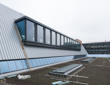 Auf den ersten Blick scheint die Umwandlung von der Druckerei zum JED relativ simpel zu sein: Die Gebäude sind verhältnismässig neu, die grossen Hallen bieten viel Platz für Einbauten, und eine Tiefgarage existiert bereits. Zudem wird das äussere Erscheinungsbild möglichst wenig verändert. Doch die Aufgabe ist alles andere als leicht: ≪Wir transformieren einen Industriebau aus den frühen 1990er-Jahren in ein Bürogebäude des 21. Jahrhunderts≫, sagt Christian Ulrich, Gesamtprojektleiter für JED bei Halter. Damit die Räume für die neue Nutzung passen, müssen beispielsweise Fensterbänder und Oberlichter nachgerüstet, grosse Ausschnitte in Betondecken geschnitten, Wände gedämmt, neue Geschosse eingezogen, die komplette Haustechnik mit Lüftung, Heizung und Kühlung eingebaut und die Tiefgarage erweitert werden. Dabei stossen immer wieder Welten aufeinander: Die bauphysikalischen, statischen und brandtechnischen Lösungen der Industriegebäude aus den Jahren 1991 und 2004 haben wenig gemein mit den heutigen Anforderungen an ein hochwertiges Bürogebäude und eine Eventhalle. Das zeigt sich eindrücklich am Aufwand, der nötig war, um die Druckereihalle in Büros und Werkstätten für Zühlke umzunutzen. So reichte die Tragfähigkeit der Fundamente in der Halle nicht aus, um einen viergeschossigen Einbau aus Beton zu realisieren – was aus brandschutztechnischer Sicht die einfachste Lösung gewesen wäre. Deshalb entschied man sich für eine Stahlkonstruktion. Diese wiederum machte den Einbau einer Sprinkleranlage sowie feuerfeste Spezialanstriche notwendig. Ebenso mussten neue Fensterbänder integriert, Installationen für Heizung, Kühlung und Lüftung untergebracht und die Fassade zusätzlich gedämmt werden. Dazu kamen weitere erschwerende Randbedingungen: Für den vertikalen Transport der Baumaterialien stehen während des Umbaus des gesamten Gebäudekomplexes nur die zwei bereits vorhandenen Warenlifte der Druckerei zur Verfügung. Mit Kranen kann kaum gearbeitet werden – einerseits, weil sonst Dächer geöffnet werden müssten, andererseits weil direkt am Gebäude die vierspurige SBB-Linie vorbeiführt. In deren Nähe darf ohne eine sehr teure und aufwendige Schutzwand kein Kran eingesetzt werden.
