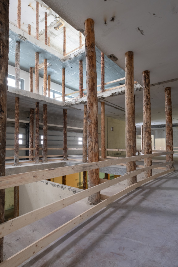 Herausfordernd war nicht nur die bauliche Seite, sondern auch die planerische: Aufgrund des engen Zeitplans konnte der Umbau nur zum Teil vorausgeplant werden. Detaillösungen mussten und müssen deshalb immer wieder vor Ort gefunden werden. ≪Oft entscheiden wir zusammen mit den Architekten und Handwerkern direkt auf der Baustelle, was zu tun ist, und führen die Plane später nach≫, sagt Gesamtprojektleiter Christian Ulrich. Um laufend präsent zu sein, haben er und seine drei Mitarbeitenden ihr Büro vor Ort aufgeschlagen – in der ehemaligen Chefetage der Druckerei. Die Architekten arbeiten ein Geschoss tiefer. ≪So können wir jederzeit ad hoc reagieren≫, fügt Ulrich an. In seiner 30-jährigen Karriere, in der er schon an anderen grossen Projekten beteiligt war, sei JED für ihn die bisher grösste Herausforderung: ≪Wir müssen Tag für Tag extrem flexibel sein und rasch reagieren, damit wir planmässig vorankommen.≫