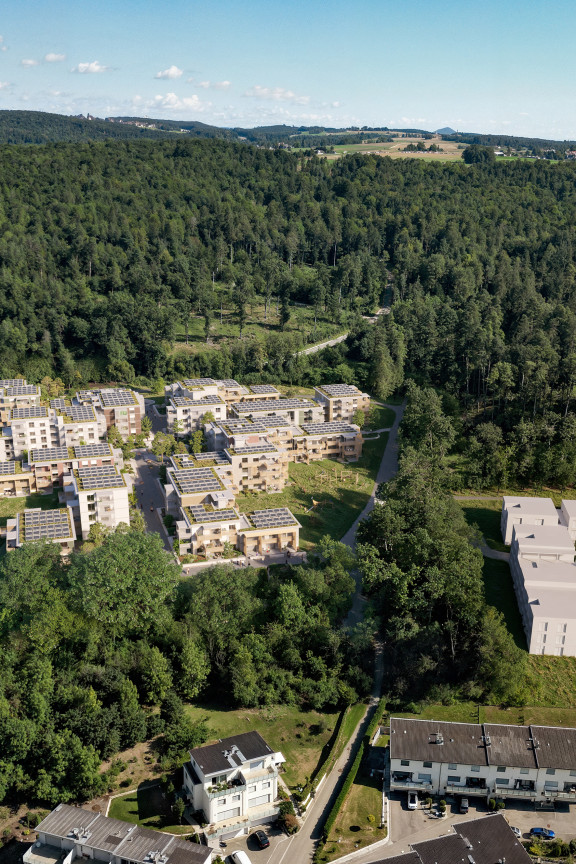 Nach dem Scheitern der Klinikpläne ging 2009 die ORE GmbH aus Schaffhausen auf die GF Immobilien AG zu und leitete eine Landanbindung in die Wege. Basierend auf dem Quartierplan, startete Dost Architektur anschliessend mit ersten Studien für eine Wohnsiedlung. «Seither hat uns das Projekt nicht mehr losgelassen», sagt Dominic Meister, Partner bei Dost Architektur in Schaffhausen. Der erste Anlauf zur Realisierung klappte nicht, jedoch wurde weiter am Projekt festgehalten und im Jahr 2021 erneut eine Baueingabe eingereicht. So entstand die «Waldstadt im Pantli», eine in sich geschlossene Siedlung ohne direkte bauliche Verbindung zum restlichen Siedlungsraum. Grund dafür ist die immer noch spezielle Lage: Das rund zehn Fussballfelder grosse Baugrundstück befindet sich auf einer Waldlichtung am Nordrand der Stadt. «Heute wäre so etwas eigentlich gar nicht mehr möglich», erklärt Architekt Andi Loew. Auch er ist Partner bei Dost Architektur. Der Durchhaltewillen hat sich gelohnt, denn nochmals vier Jahre später wird endlich gebaut: Am 10. Januar 2025 fand der Spatenstich statt, im Sommer 2027 sollen die ersten Eigentümerinnen und Eigentümer in ihre neuen Wohnungen einziehen. Möglich wurde die Realisierung des Projekts schliesslich durch den Einstieg der Halter AG mit ihrer Tochterfirma Belvedere Neuhausen AG. «Die Einmaligkeit des Projekts an dieser Lage hat uns überzeugt, und dank dem Projekt Rhyfall Village kannten wir den Schaffhauser Immobilienmarkt gut genug, um die Machbarkeit abschätzen zu können», sagt Roman Kummer, Projektleiter bei Halter Entwicklungen. Neben der Besonderheit einer Siedlung mitten auf einer Waldlichtung bietet das Projekt für Kummer noch weitere Pluspunkte: Dazu zählen etwa ein Kindergarten, eine Kindertagesstätte und ein Gemeinschaftsraum im historischen Transformatorenhäuschen oder die Anbindung ans Busnetz und damit der Zugang zu Einkaufsmöglichkeiten sowie die Nähe zum Autobahnanschluss in Richtung Zürich und Süddeutschland. «Gerade für Leute aus dem Grossraum Zürich, die nach einer bezahlbaren Eigentumswohnung suchen, ist das Angebot sehr interessant», ergänzt Roman Kummer. So kostet etwa eine 4,5-Zimmer-Wohnung mit 100 Quadratmetern Wohnfläche um die 800 000 Franken. In den ersten beiden Etappen entstehen die Gebäude auf der grossen, ganz von Wald umgebenen Hauptfläche, die rund vier Fünftel des Areals ausmacht. Ein zusätzlicher Teil befindet sich auf einer kleineren, separaten Lichtung, knapp fünfzig Meter weiter östlich. Dieser Bereich soll in einer dritten Etappe bebaut werden. Beide Siedlungsteile werden nach dem besonders strengen Nachhaltigkeitsstandard SNBS geplant und realisiert.