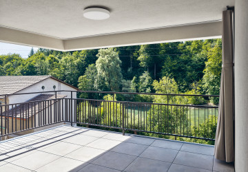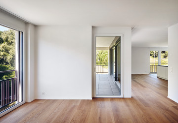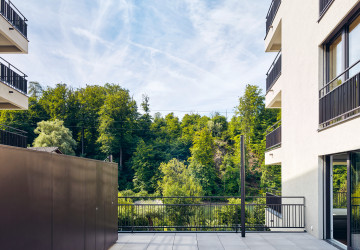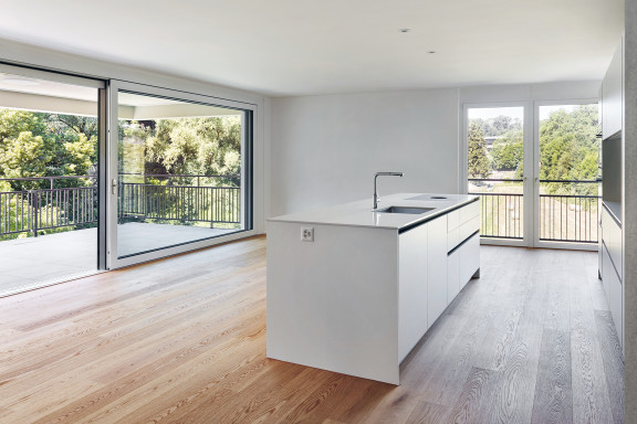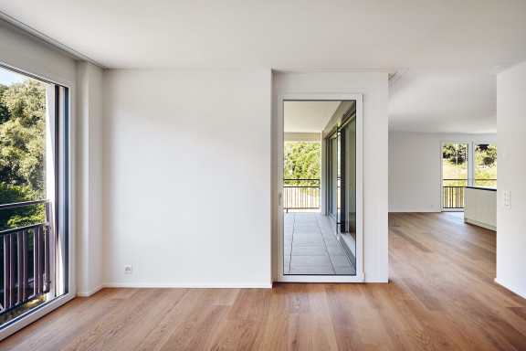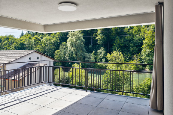 Wer eine der vier Maisonettewohnungen in der Sockelzone besitzt, betritt diese über die angrenzende Terrasse. In den zweigeschossigen Wohnungen mit direktem Kellerzugang lebt es sich fast wie im Einfamilienhaus. Die übrigen 73 Wohnungen verteilen sich auf die fünf Haupthäuser und bieten einen vielfältigen Mix, der vom Studio mit 35 Quadratmetern bis zur 153 Quadratmeter grossen 5,5-Zimmer-Wohnung reicht. Viele Einheiten zeichnen sich durch einen Wohnbereich mit angrenzender Loggia aus, von wo man auf die Aare und den bewaldeten Hang am gegenüberliegenden Ufer blickt. Dieses Panorama verleiht den Wohnungen eine einmalige Atmosphäre. Davon sei er stets aufs Neue fasziniert, schwärmt ein Bewohner: «Mit jeder Jahreszeit ändern sich die Farben und die Stimmung – fast so, als würde ich aus meinem Wohnzimmer ein Bild von Franz Gertsch betrachten.» Ein paar wenigen Bewohnerinnen und Bewohnern, deren Wohnungen sich zum Hang orientieren, bleibt diese Aussicht verwehrt. Doch direkt vor ihrer Haustür dehnt sich eine grosse Wiese aus, die dazu einlädt, Liegestühle, Badetücher oder Picknickdecken auszubreiten und den Blick auf den Flussraum aus dieser Perspektive zu geniessen. Besonders im Sommer, wenn auf und neben der Aare reger Betrieb herrscht, färbt das urbane Flair der nahen Stadt auf die Umgebung der Hammerwerke ab und verdeutlicht deren attraktive Lage: mitten im Grünen und doch nur eine Flussbreite von Bern entfernt.