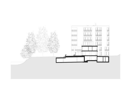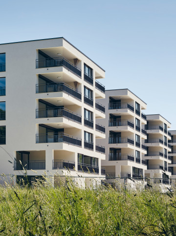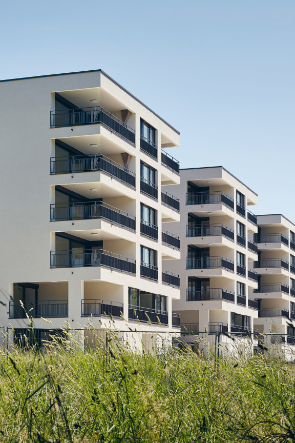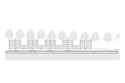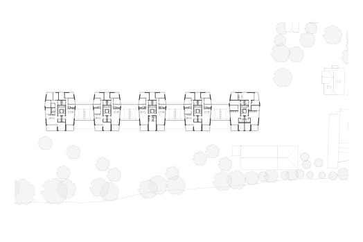Als wolle die Überbauung dem Fluss Respekt zollen, weicht sie davon zurück und sucht die Nähe zum nordseitigen Steilhang. Das Team um Michael Schmid von Büro B Architekten schlug einen zusammenhängenden Gebäudekörper vor, der parallel zur Aare verläuft und sich leicht vom Terrain abhebt. Damit konnte es den Studienauftrag für sich entscheiden. «Die einfache Bebauungsstruktur besteht aus fünf Turmhäusern, die über einen zweigeschossigen Sockelbau miteinander verbunden sind», erklärt der Architekt. «So gewährleistet die Siedlung eine visuelle Durchlässigkeit zwischen dem Flussraum auf der einen und dem Hang auf der anderen Seite.» Jeder Gebäudeteil verfügt über einen attraktiven, südseitigen Zugang und ist über den vorgelagerten Gehweg erreichbar. Die um ein paar Stufen vom Terrain abgehobene Esplanade schützt den Wohnbau vor einem 300-Jahr-Hochwasser. Gleichzeitig wird sie zu einer halbprivaten Flaniermeile, wo sich die Bewohnerinnen und Bewohner im Alltag begegnen.