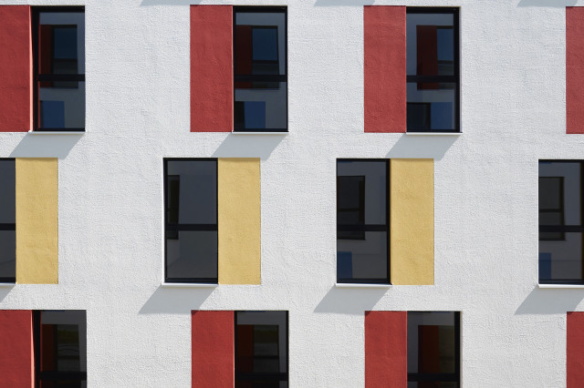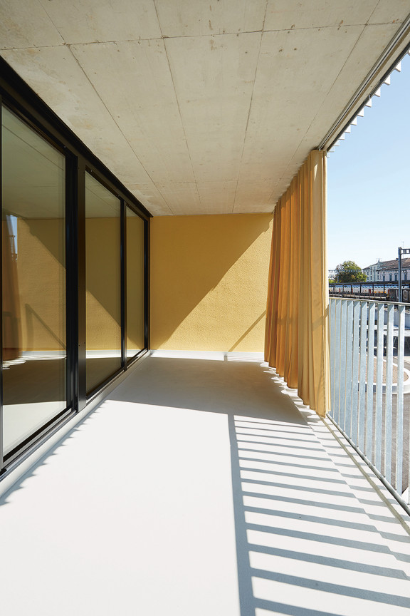 Auf den Längsseiten dagegen liegen ausschliesslich Schlafräume ohne Balkone oder Loggien, dafür mit schmalen, hohen Fenstern. Diese bieten zwar keine Panorama-Aussicht, lassen aber reichlich Licht hinein», erklärt Yves Schihin, langjähriger Büropartner von Burkhalter Sumi Architekten, das ausgefeilte Zusammenwirken von Gebäuden, Grundriss und Materialisierung. Die Fenster sind zudem versetzt angeordnet, was Einblicke zum Nachbarhaus erschwert. Farbige Flächen auf Feinputz vergrössern sie optisch. Im Verlauf des Tages erzeugen Licht und Schatten eine starke eigene Atmosphäre, die an ein abstraktes Gemälde erinnert und unerwartet einen ruhigen Gegenpol zum umtriebigen Bahnhof bildet.