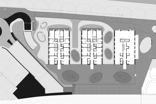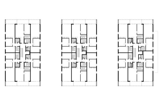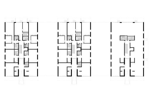 Um sich städtebaulich behaupten zu können und gleichzeitig guten Wohnraum zu bieten, treiben die drei Neubauten von Burkhalter Sumi Architekten ein Doppelspiel: Sie können zusammen als Riegel oder als Einzelgebäude gelesen werden. Der umlaufende, silberfarbene Besenputz und die rückspringende Erdgeschosszone betonen die äussere Einheit, die ein Gegenüber zur Bahnhofsfront bildet; die weiss gestrichenen Zwischenräume versichern, dass es sich hier um drei einzelne Bauten handelt, die den kleinteiligen Bebauungsrhythmus der hiesigen Seite der Bahnlinie weiterführen.