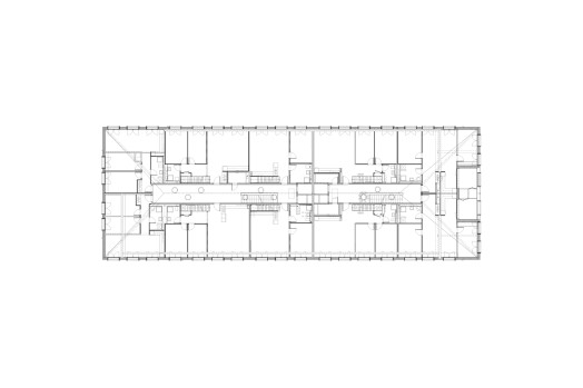 Die Verdichtung durch Aufstockung ist eine grosse technische Herausforderung, die hier durch die Logistik auf einer Baustelle mit beengten Verhältnissen zusätzlich erschwert wurde. Als Erstes mussten die Dächer der Gebäude entfernt werden, um Platz für ein neues Dachgeschoss entlang der Rue Vogt sowie zwei zusätzliche Stockwerke auf der Seite des Boulevard de Pérolles zu schaffen. Die nächste Herausforderung bestand darin, die Eingriffe unter Beibehaltung der bestehenden tragenden Elemente auszuführen. Eine Holz-Beton-Verbundkonstruktion ermöglichte es, das Gewicht der Aufbauten so gering wie möglich zu halten. Trotzdem mussten mehrere tragende Wände verstärkt werden, insbesondere im obersten Stockwerk, damit sie die Last der neuen Gebäudeteile aufnehmen können und um die Erschliessungskerne aus Stahlbeton zu erhöhen. Die Aufbauten wurden mit einem vorgefertigten, gefalzten Blech verkleidet und von den bestehenden Fassaden zurückversetzt, sodass der Unterschied zwischen dem Altbau und den neuen Stockwerken besser zum Ausdruck kommt. Zugleich konnte das Gewicht des Neubaus verringert werden. Diese architektonischen Gesten unterstreichen die Entwicklung des Gebäudekomplexes und bewahren gleichzeitig seine historische Integrität.