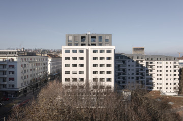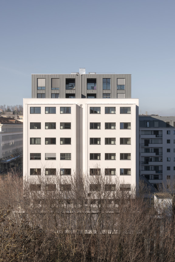 Dies war der Startschuss für ein umfassendes Projekt, das von der Bauherrschaft PKE Vorsorgestiftung Energie initiiert wurde. Das oberste Ziel war es, den heutigen Anforderungen an die Energieeffizienz gerecht zu werden. Mit einer Asbestsanierung, neuen Isolierungen und energetischen Verbesserungen wurde für die alternde Substanz ein nachhaltiges Umbaukonzept entwickelt. Die Modernisierung beschränkte sich jedoch nicht nur auf thermische Verbesserungen. Durch die grundlegende Renovation aller 147 bestehenden Wohnungen und die anschliessende Aufstockung des Gebäudes zur Schaffung von 28 neuen Wohnungen wurde das Projekt zu einem echten Beispiel für das Potenzial einer vertikalen Verdichtung im historischen Bestand.