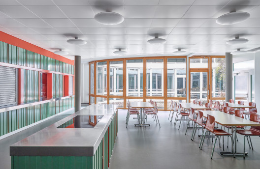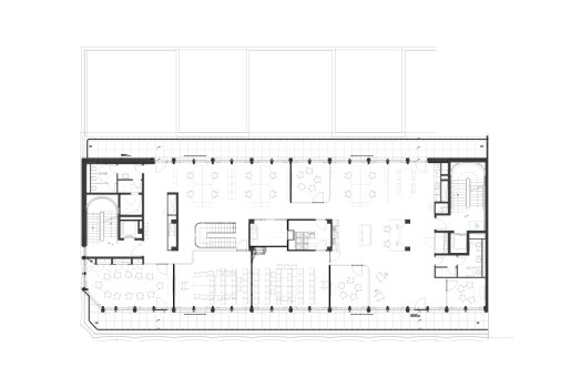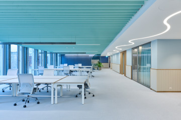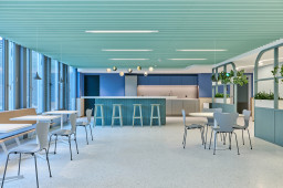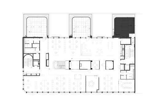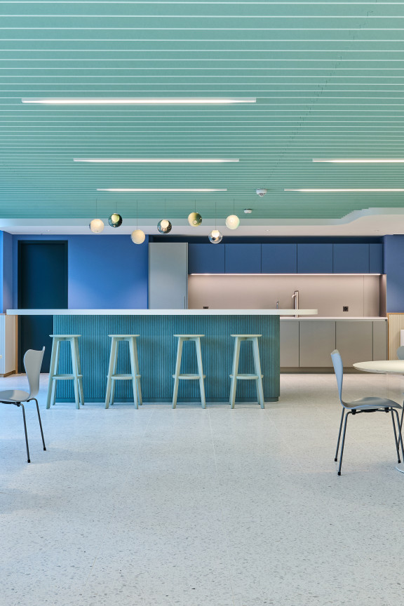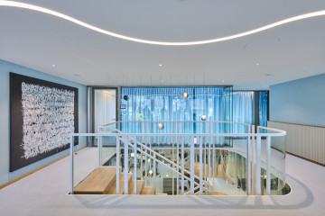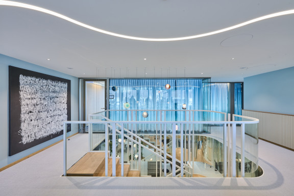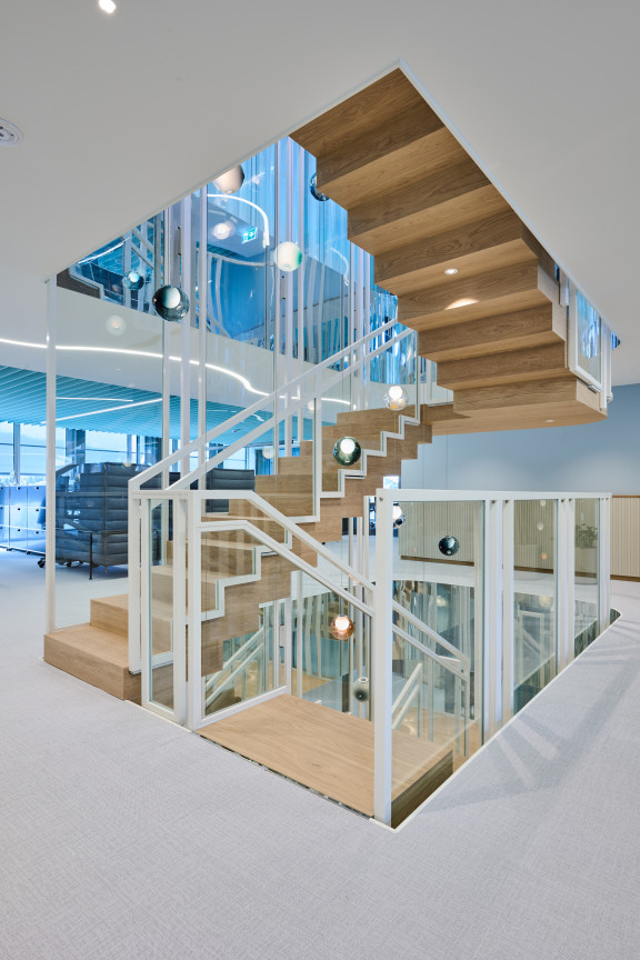 Les 2e et 3e étages ne bénéficient pas de fenêtres pleine hauteur, mais d’une vaste terrasse sur cour. Au centre de chaque étage, une zone de service remplit des fonctions structurantes, acoustiques et visuelles. Cet espace accueille les imprimantes, les bacs de collecte du papier et des déchets, pour laisser plus de place autour des postes de travail. Le 3e étage abrite également deux salles de réunion supplémentaires, dont les cloisons vitrées en courbe viennent rompre le côté rectiligne du reste de l’agencement. L’espace détente et cuisine côté cour est vite devenu l’un des endroits favoris. Éclairé par des suspensions sphériques Bocci en verre soufflé, un large bar surplombe un sol en terrazzo. Ces mêmes lampes flottent telles des bulles d’air dans l’escalier intérieur reliant les différents étages. «Tout l’éclairage repose sur ce concept. Une bande LED aux teintes chaudes suit un tracé ondoyant à travers les zones de circulation rectilignes et vient rehausser les plafonds», ajoute Kerstin Schuller. Le remarquable escalier se compose d’une structure en acier thermolaqué blanc pur et d’éléments de remplissage en verre, tandis qu’un parquet en chêne habille les marches. Les plus sportifs l’empruntent pour passer du 3e au 5e étage. Au 3e étage, des alcôves Vitra de couleur bleu algue font face à l’escalier. Elles proviennent, comme une grande partie du mobilier, des anciens bureaux. «Le client tenait à réutiliser son mobilier haut de gamme. Pour les salles de réunion, un menuisier a poncé les tables en bois massif de Mobimex, puis leur a appliqué une lasure claire. Cela a permis de créer une parfaite harmonie avec le reste du mobilier tout en répondant aux attentes de réemploi», précise Kerstin Schuller.
