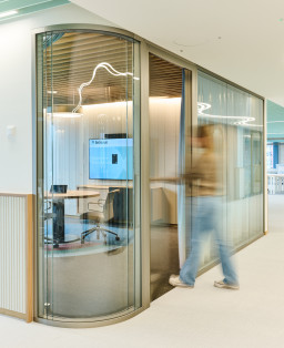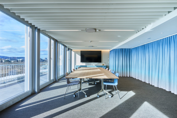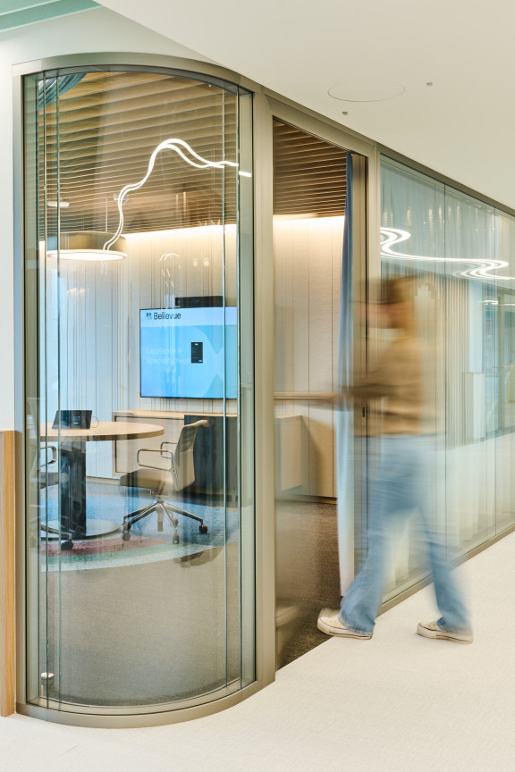 Les gestionnaires de portefeuille se trouvent un étage plus bas. Leur open space s’articule autour de salles de réunion agencées en blocs centraux, pour faciliter les échanges au sein de l’équipe tout en limitant le bruit. Juste à côté se trouve un coin cosy. Équipé d’un fauteuil pivotant et de moquette, il permet de s’isoler pour téléphoner. Pour encore plus de discrétion, on peut, comme dans toutes les salles de réunion vitrées, tirer les longs rideaux pleine hauteur dans un camaïeu bleu-vert aux tons pâles. «À Küsnacht, les anciens espaces étaient très ouverts. L’une des principales exigences était donc de réduire fortement le niveau sonore. Cela a notamment été rendu possible avec un faux-plancher insonorisé, de la moquette et des dalles en vinyle tissé. Par ailleurs, des panneaux muraux en PET recyclé composés d’une mousse isolante de 4 centimètres absorbent les fréquences basses et élevées. Les salles de réunion cloisonnent aussi l’espace», explique Kerstin Schuller.