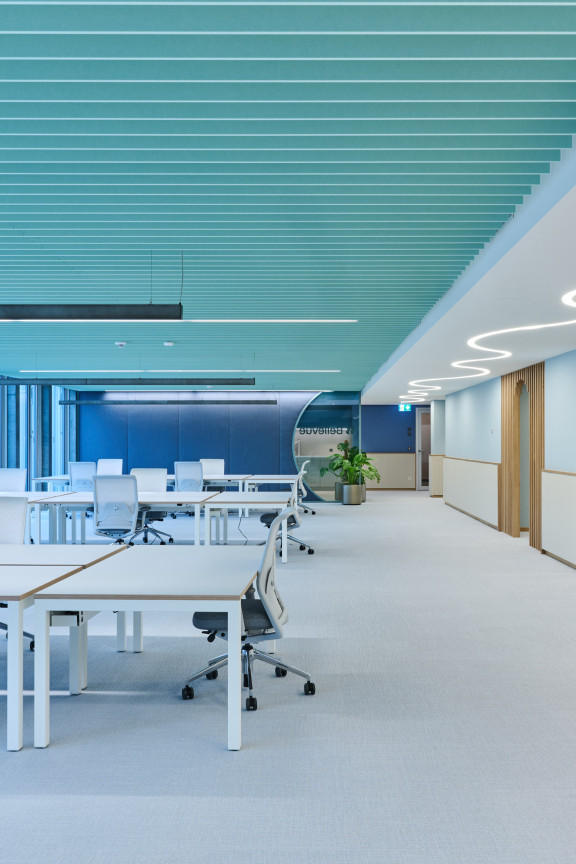 Dès la réception au 5e étage, les références au lac tout proche s’imposent. On découvre par exemple des formes organiques ou encore des rideaux de chaînettes scintillantes rappelant les reflets de l’eau sous le soleil et disposés de sorte à créer l’impression d’une coupole. La palette de couleurs reprend le bleu du logo de Bellevue Group, qui sert d’élément récurrent pour l’aménagement intérieur. Guère étonnant, alors, que le projet ait été intitulé «Lake Bound» par Integral design-build AG, prestataire global chargé de l’aménagement intérieur et de l’ameublement. «Il y a quelques années, nous avions agencé les bureaux zougois du gestionnaire d’actifs. L’entreprise avait donc pleinement confiance en nous et nous avions toute liberté pour élaborer le concept. De l’idée initiale à l’emménagement, il aura fallu près d’un an», retrace Kerstin Schuller, cheffe de projet chez Integral. Le travail de l’équipe suit toujours une stratégie bien définie qui intègre des éléments tant fonctionnels qu’émotionnels.