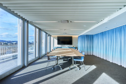 Entièrement dédié à l’accueil de la clientèle, le 5e étage offre une vue splendide sur la Sechseläutenplatz et jusqu’au lac, que l’on peut admirer sous différents angles depuis une longue terrasse. Les deux salles de réunion les plus spacieuses, qui disposent d’un système de sonorisation, de grands écrans ainsi que de microphones de qualité, peuvent être regroupées pour former un auditorium de soixante places. En plus des voiles réfrigérantes, des panneaux acoustiques ont également été installés au plafond. Cet espace a permis d’organiser en interne les manifestations de Bellevue Group, qui se tenaient jusqu’alors une ou deux fois par mois en extérieur. Les tables, chaises et pupitres sont stockés dans un local attenant.