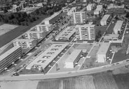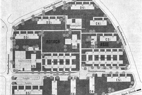 Les coopératives d’habitation abandonnaient elles aussi de plus en plus les ensembles accueillants avec leurs immeubles linéaires de deux à quatre étages. En lieu et place, des ensembles modernes ont vu le jour à la périphérie des centres urbains. En y combinant des blocs d’habitation de quatre à douze étages, des barres et des tours, ainsi que des immeubles en terrasse plus bas et des maisons mitoyennes, les planificateurs ont brisé la monotonie déplorée des anciens lotissements modèles et ont créé de vastes espaces extérieurs. A côté de petits lotissements coopératifs, les grands ensembles connus sont le Tscharnergut (1958–1965) à Berne-Bümpliz ou la Cité du Lignon (1962–1971) à Vernier près de Genève. La cité Obermatten, construite entre 1958 et 1963 par la coopérative de construction Rotach (bourgeoise) et la coopérative Arbeiter-Siedlungs-Genossenschaft ASIG (social-démocrate) dans la commune zurichoise de Rümlang, à proximité immédiate de l’aéroport de Kloten, constitue un exemple précoce de tels ensembles. Ce projet s’est avéré tout sauf simple. En effet, la société Rotach, responsable du projet, a passé des années à trouver un terrain approprié et abordable sur le marché foncier zurichois saturé, et sans les subventions fédérales élevées des années 1940, le financement s’était avéré difficile. C’est grâce à des crédits sur le marché régulier des capitaux et à des aides du canton et de la commune de Zurich que les coopératives ont finalement réussi à réunir les moyens financiers nécessaires. Elles ont construit une cité-jardin moderne de 292 appartements selon les plans du bureau d’architectes Walter Gachnang & Sohn. Au lieu des rangées de bâtiments bien alignées de la cité Im Herrlig des années 1940, un ensemble à la composition variée a été créé avec des maisons à atrium d’un étage, des blocs d’habitation linéaires de trois à cinq étages, ainsi que deux tours carrées de huit étages. Les bâtiments modernes et minimalistes à toit plat ont été disposés en quinconce pour laisser la place à une grande aire de jeu au centre. Les appartements traversants offraient un confort moderne pour répondre aux exigences croissantes. Le terrain à bâtir bon marché, la standardisation et les aides publiques ont permis de proposer des loyers nettement inférieurs aux loyers moyens de biens comparables dans la ville de Zurich.