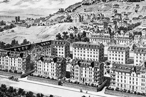 Les premières coopératives d’habitation d’utilité publique sont apparues à la fin du XIXe siècle, dans le sillage de l’industrialisation et de l’urbanisation. Les bouleversements économiques et sociaux, partis d’Angleterre, se sont accompagnés d’une croissance rapide des villes. Au cours de leurs phases d’expansion spectaculaires, souvent motivées par la spéculation, celles-ci ont vu éclater les limites de leurs murailles médiévales et se sont rapidement étendues aux campagnes environnantes. La construction de logements relevait alors du secteur privé. Alors que le développement des quartiers et des banlieues aisés, des boulevards mondains et des districts administratifs se déroulait de manière relativement ordonnée, des conditions de construction et d’hygiène précaires, ainsi que des logements densément occupés, étaient monnaie courante dans les quartiers populaires. La question des logements devint un problème central de la question sociale, débattu dans le cadre des mouvements réformateurs. Les inégalités sociales flagrantes des villes libérales du XIXe siècle suscitaient un malaise dans de larges cercles – de la gauche jusqu’à la droite. Certes, dans les villes relativement petites de Suisse, la situation n’a jamais atteint le niveau catastrophique de certaines métropoles d’autres pays industrialisés. Mais en Suisse aussi, les immeubles locatifs exigus, les entreprises artisanales et industrielles à proximité des habitations et les rues crasseuses témoignaient de la misère de larges couches de la population. Les quartiers ouvriers étaient considérés par les élites et les milieux réformateurs comme des foyers d’épidémies et suscitaient des craintes de troubles sociaux6.