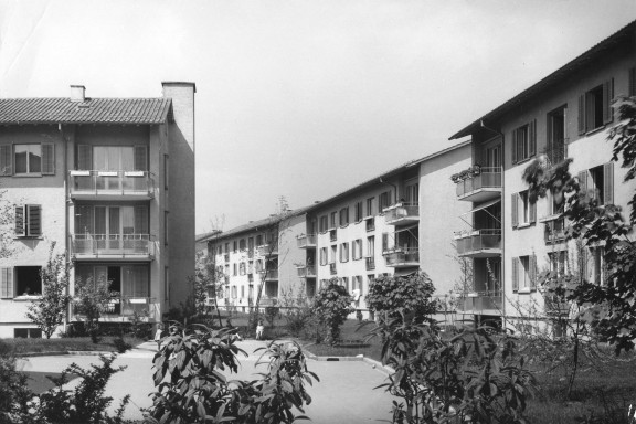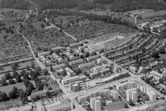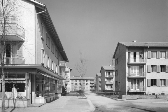 Le lotissement Im Herrlig de l’Allgemeine Baugenossenschaft Zürich ABZ, construit entre 1946 et 1948 à Altstetten, en est un exemple éloquent. La plus grande coopérative de Zurich y a construit 217 logements près de la gare, dans un style linéaire aéré – un projet de grande envergure pour la Suisse. Le bureau d’architectes Aeschlimann & Baumgartner a conçu des logements équipés de manière simple, mais confortable, dans des immeubles collectifs de trois étages, ainsi que des maisons mitoyennes de deux étages, afin de garantir des conditions d’ensoleillement optimales. Il a en outre veillé à la création de vastes espaces verts. Le lotissement disposait également d’une épicerie, d’une boucherie et d’un grand local collectif afin d’encourager activement l’esprit communautaire. La ville a honoré cette cité modèle en lui décernant une distinction. Le fait que la colonie ait été considérée comme un succès par le Conseil communal n’a rien d’étonnant, puisqu’il avait été impliqué très tôt dans la planification et avait soutenu la construction. La ville a cédé à l’ABZ un terrain à bâtir bon marché, lui a accordé des hypothèques et des subventions, mais en contrepartie, elle s’est réservé des droits de codécision. Cette collaboration entre le public et le privé était typique des campagnes de construction de logements subventionnés entre 1942 et 1949. A Zurich, les coopératives de construction de logements sont devenues de véritables organes exécutifs du Service des constructions et de son responsable, l’architecte de la ville Albert Heinrich Steiner, afin de mener à bien la transformation rapide de la ville.