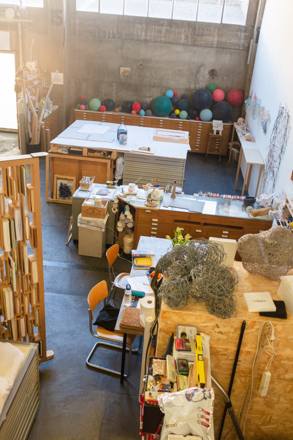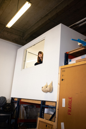 Les oeuvres de Sophie Bouvier Ausländer se nourrissent du contexte dans lequel elles apparaissent et de la mise en relation de différents thèmes. En ce qui concerne la BäreTower, développée par Halter SA pour l’investisseur Helvetia Assurances, la plasticienne romande a créé dans le cadre d’un projet d’intervention artistique une sculpture qui fait également office d’abri pour la Bärenplatz. Trois mois avant l’arrivée des habitants dans l’immeuble, nous avons rendu visite à l’artiste dans son atelier à Lausanne. Celui-ci se trouve non loin du centre-ville, dans un ancien entrepôt près des voies ferrées. Une rampe de chargement permet d’accéder à une grande pièce composée de différents espaces de travail. On y trouve des tables à dessin, des étagères avec des curiosités telles que des écorces d’arbres ou des nids de guêpes, des chariots avec des outils et du matériel de peinture, des oeuvres d’art archivées dans des tiroirs. De fragiles créations en papier mâché sont accrochées aux murs. Un petit bureau chauffé est installé dans un conteneur sur pilotis. A côté se trouve une estrade construite en palettes, sur laquelle sont disposées des maquettes de projets en cours. Des croquis, des échantillons de matériaux et des plans documentent leur état actuel.