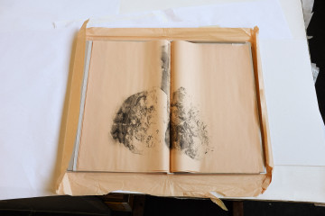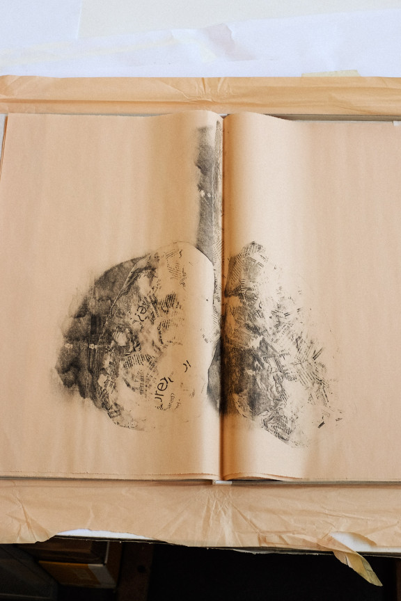 Seulement des bribes de mots. J’ai réalisé des impressions par technique de transfert des photographies d’organes en papier mâché, combinées avec des bribes de textes du journal. On dirait que j’ai jeté les mots en l’air et qu’ils sont retombés par fragments sur le papier. Mon but était de raconter des mondes différents et de montrer les contradictions. Les deux poumons sont représentés au milieu du livre. Exposé l’été dernier au Musée d’art contemporain de Rome, il a également fait l’objet d’une performance.
