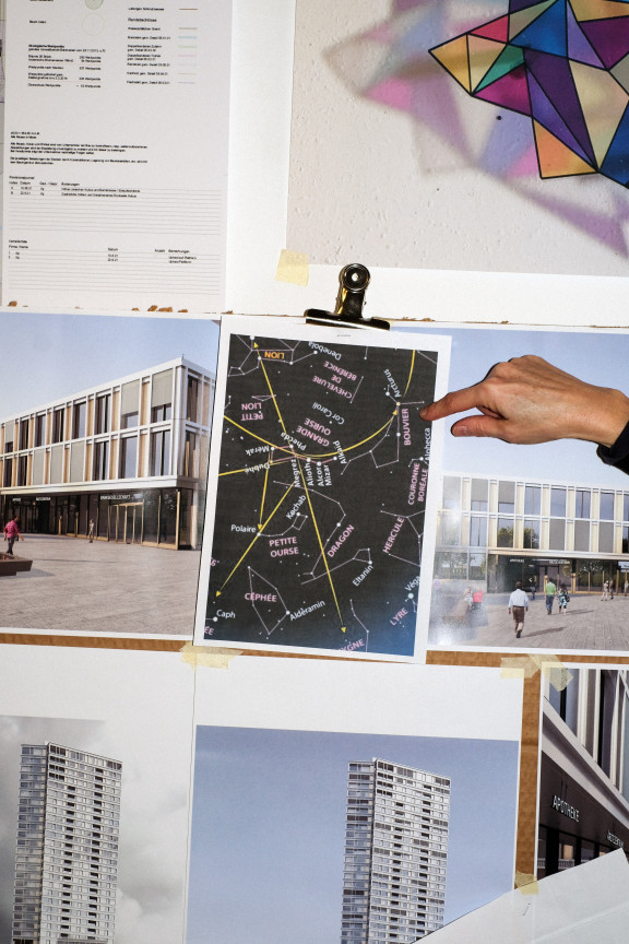 Ce qui m’a également intéressée dès ma première montée en ascenseur au sommet de la BäreTower, c’est la relation entre le ciel et la terre. Et comme je travaille beaucoup avec des cartes géographiques, je me suis dit que je pourrais tout aussi bien regarder une carte du ciel pour une fois. J’y ai découvert les constellations de la Grande Ourse et de la Petite Ourse, et juste à côté celle du Bouvier – le « Gardien de l’Ours ». Or, Bouvier est aussi mon nom de famille. J’ai trouvé cela incroyable. Cela ressemblait presque à un coup du destin. En plus, tous les participants me disaient à quel point l’ours était important pour le projet et pour Berne. Ursinae est le nom latin et scientifique de la constellation.