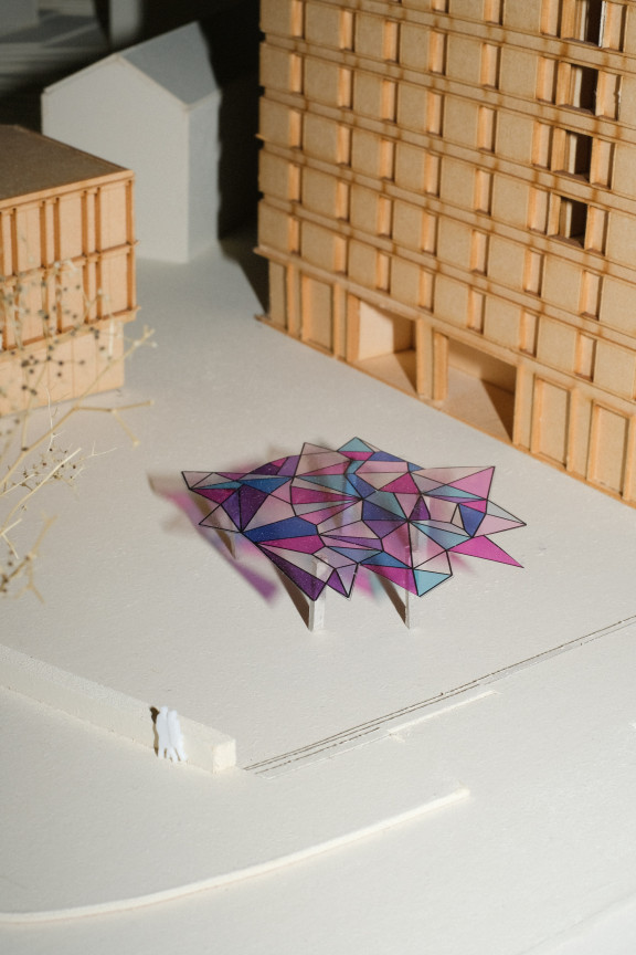 Je sais. La collégiale de Berne ne fait que 60 centimètres de plus. Il existe une loi tacite à Berne selon laquelle aucun bâtiment ne doit la dépasser. Ce fait, ainsi que certains de ses éléments visuels, sont les raisons pour lesquelles je me suis intéressée à la collégiale dès le début. Je la connaissais déjà auparavant, mais je l’ai redécouverte dans le cadre du projet. J’ai été particulièrement impressionnée par la structure de la voûte de la nef centrale et par les vitraux sertis au plomb. Mon travail est censé y faire écho.