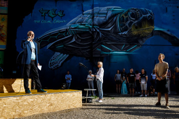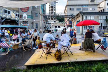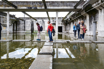 Blocher unterdessen ist auf eine Art geblieben, als grösste Wandmalerei des Landes. Angeschmiert durch eine Farbattacke. Die beiden Schweizer Künstler S2 13 und Gen Atem, Pioniere der Urban Art Szene, schufen das rund 1000 Quadratmeter grosse Wandbild. Das durchaus kontrovers diskutiert wird. Am Nachmittag unseres Besuchs hat darunter eine Festgesellschaft Platz genommen. Bis zu 800 Leuten bietet die Betontribüne Platz. Es wird Hochzeit gefeiert, ein Freund des Paares hält eine Rede. Zwischen seinen Worten weht es Beats herüber. In direkter Nachbarschaft posieren ein paar Jungs mit grosser Geste vor noch grösserer Karre. Die «verbotene Stadt» als coole Hintergrundkulisse eines Hip-Hop-Videos. Über die Arena steigt man zum Vorplatz, zum ehemaligen Säureturm und der Kiesofenhalle. Beides ist denkmalgeschützt. Hier standen einst in den Boden eingelassene Lagertanks, heute ist da ein Spielplatz mit unterirdischem Labyrinth. Kinder spielen hier Fangen, man hört ihr Lachen.