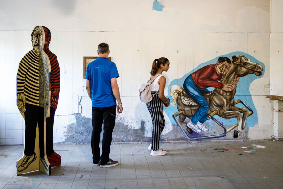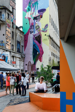 Bis das Attisholz-Areal einmal bewohnt wird, hat die Kunst hier Einzug gehalten. Drei Sommer über trieb das Projekt «Kettenreaktion» seine künstlerischen Blüten, belebte die verlassenen Hallen. Die Halter AG unterstützt dabei den Verein Behind The Surface (BTS). Dessen Initiator Werne Feller ist überzeugt: «Kunst und Kultur bringt die Entwicklung des grossen Geländes voran und füllt es schon jetzt mit Leben.» Er selbst ist mit seinem Verein Experte darin, Plattformen für Künstler zu schaffen. 2016 initiierte Feller hier zum ersten Mal das interdisziplinäre Kunst- und Urban-Art-Festival. Nationale und internationale Kunstschaffende aus den Bereichen Urban Art, Kunst, Design, Installation oder Fotografie verwandelten die Räume und Hallen der ehemaligen Zellulosefabrik in einen der grössten Kunsträume der Schweiz. Einen Treffpunkt der Gegenwartskunst mit Graffitis, Kabinetten, Objekten und Installationen. Die neue Besitzerin des Areals überzeugte das Konzept der Arealinszenierung. Entstanden ist daraus die Beiz Kantine, betrieben vom in der Solothurner Gastroszene bekannten Ueli Wüthrich. Hier gibt es regelmässig Musik auf die Ohren und Leckeres auf den Teller. Im Winter Fondue und Eintöpfe. Im Sommer Grilladen. Früher war dies die Portierloge, hier kamen die Arbeiter vorbei, um sich registrieren zu lassen. Heute sitzen hier Familien in der Sonne, junge Paare, Freunde treffen sich auf ein Bier. Das Leben ist zurück in den Gemäuern, die Farbe atmen. Die Spätsommer-Sonne blinzelt zwischen den Betonriesen hindurch. Streift riesige Murals, eine Schildkröte des Basler Künstlers Dest Jones, sie bescheint eine bunt gekleidete Frau mit Lilien auf dem Kopf. Das Porträt der kalifornischen Muralistin Monica Canilao ist 40 Meter hoch und vom Duo Husmann/Tschaeni.