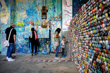 Die Graffitis an den Wänden haben derweil Halbwertszeit, viele aus dem Vorjahr wurden mit neuen übermalt. Urban Art lebt nicht hinter Plexiglas. Einen selbst zieht es in den Bauch des «Artcampus», rein in die grosse Halle, «die Werkstatt». Grossformatige Wandmalereien sieht man hier, Mario Merkle hinterliess Schwangere und Teufel, Schmetterlingsfrauen und Adler in Bonbonfarben, da drüben ist die Intervention «Attis-Adventures 3000» von Lea Fröhlicher und Olivia Hegetschweiler zu erleben. Die beiden Künstlerinnen versprechen den Besuchern vielfältige Freizeiterlebnisse, ein augenzwinkernder Kommentar zur Arealentwicklung, zu Eventkultur und Spassgesellschaft. Der «Drugsomat» von Martin Gut in der Kocherei ist leider gerade defekt. Man steigt Treppen hoch, entdeckt Hinterhöfe, läuft durch Gänge, durch winzige Räume, riesige. Es riecht nach Farbe, man streift mit den Fingern über die Betonwände, staunt sich durch pinke Räume, Räume in schwarz-weiss. Während der «Kettenreaktion» gab es hier auch Musik, Tanz, Film, Fotografie, Installationen und Performances, Kurse und Führungen.