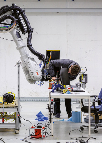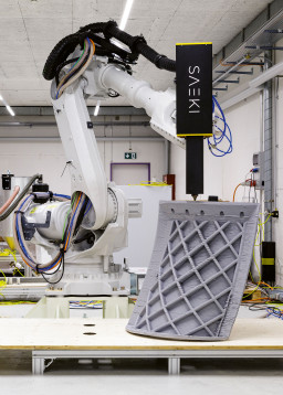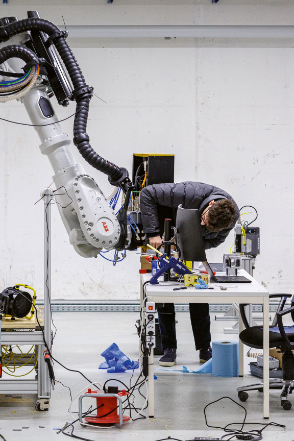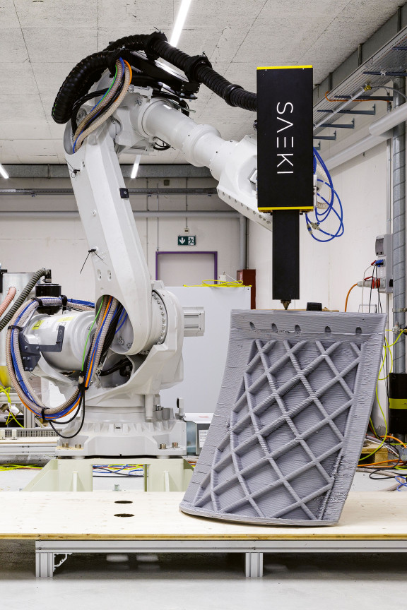 Le deuxième sous-sol de la tour 2 abrite depuis mai 2022 Saeki Robotics, une entreprise de l’industrie 4.0 qui imprime des coffrages en béton pour la branche du bâtiment à l’aide d’un robot industriel géant. Cette start-up, une spin-off de l’EPF de Zurich, a développé une tête d’impression 3D ainsi que le logiciel correspondant. Alors que les coffrages convexes ou concaves devaient traditionnellement être fabriqués à la main en bois par des charpentiers pendant plusieurs jours, Saeki les imprime en quelques heures seulement dans un plastique spécial. N’importe quelle forme imaginable peut être imprimée – le temps de production dépend uniquement de la taille du coffrage. Les fabrications spéciales coûteuses comme des escaliers ou des plafonds voûtés en béton deviennent ainsi nettement moins chères.