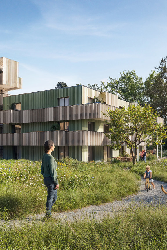 Ce projet de lotissement témoigne d’une réflexion approfondie des architectes sur le lieu et le type de construction approprié. Ils ont analysé les structures de petits peuplements comme les villages traditionnels ou les colonies de la Grèce antique ou de l’époque romaine. Ils ont également confronté leurs idées avec celles d’autres spécialistes, comme l’urbaniste et ancien architecte cantonal bâlois Carl Fingerhuth, décédé en 2021. «Nous voulions créer un environnement propice au bien-être et à la vie collective», commente Andi Loew. L’unité principale dans la grande clairière forme une croix constituée de deux axes de desserte interdits aux voitures, qui se déploient du nord au sud et d’est en ouest. À leur intersection s’étend la place du quartier. Au nord, l’accès principal au lotissement est doté d’une boucle de retournement pour les bus et d’une entrée au parking souterrain. À l’extrémité sud se trouve une aire de jeux. Une petite place forme une transition avec la forêt aux deux extrémités de cet axe transversal. Les ruelles sont bordées par des bâtiments de trois à cinq niveaux dont la variété architecturale est assurée par des avancées et des retraits, de grands balcons ainsi que des jardins privatifs devant les appartements. Cette impression est renforcée par la diversité des matériaux des façades. «Chaque immeuble a un visage qui lui est propre, reconnaissable», explique l’architecte Dominic Meister. Le caractère des deux ruelles diffère: celle qui relie le nord au sud sert de liaison animée entre les trois places, l’axe transversal plus étroit ne dessert que les immeubles d’habitation et affiche des traits plus intimes. Des prairies naturelles s’étendent tout autour du lotissement. Cette dualité se retrouve également dans les plans d’étage: presque tous les logements sont tournés à la fois vers la ruelle et vers la nature. Selon l’emplacement, ils sont orientés soit nord-sud, soit est-ouest. Les espaces salon, salle à manger et cuisine sont traversants. Les futurs résidents peuvent décider personnellement de la répartition de la surface habitable. «Nous nous sommes volontairement abstenus de toute division», précise Dominic Meister. La double exposition est accentuée par des balcons disposés des deux côtés des bâtiments. À la fin des travaux, le lotissement comprendra 214 appartements allant du 2½ au 5½ pièces, conçus majoritairement pour des familles. La première étape verra la réalisation de 104 appartements, tandis que 78 autres seront construits dans un deuxième temps. Lors de la troisième phase, prévoyant des bâtiments plus compacts disposés autour d’une cour intérieure, 32 unités supplémentaires pourront être livrées. Leur réalisation est toutefois en fonction de la demande. «Notre but serait d’éviter autant que possible une interruption des travaux», explique le chef de projet Roman Kummer. La vie collective se met activement en place dès la première étape: par l’acte de vente, les acquéreurs deviennent membres de l’association de quartier moyennant une cotisation annuelle. Cette adhésion garantit dès le départ un budget pour les activités collectives, comme pour la fête du lotissement prévue après l’emménagement en 2027.